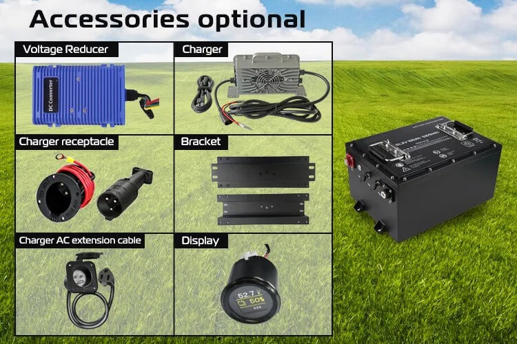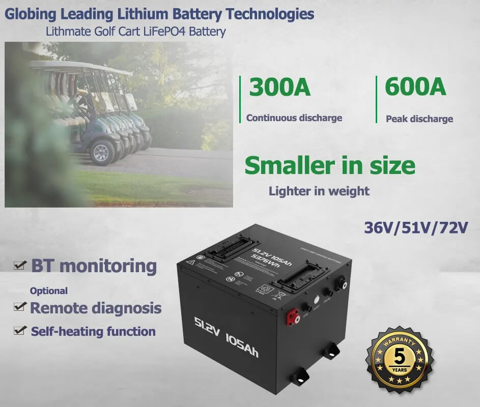 【Smart Battery Monitor LCD】The ALL IN ONE lithium golf cart battery offers robust acceleration and performance, enabling users to conquer challenging terrain and extend their golf range up to 50 miles on a single charge.