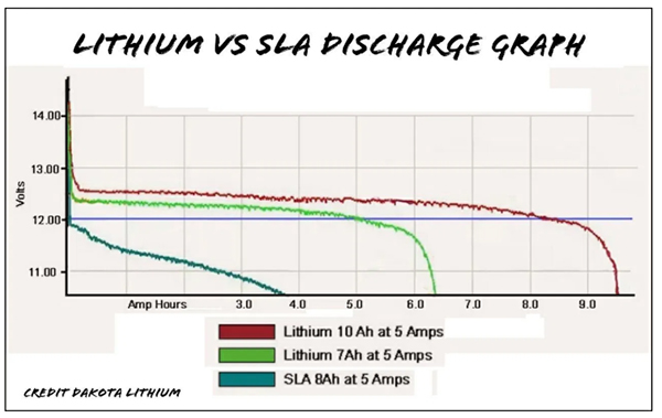 - Οι μικρές σφραγισμένες μπαταρίες μολύβδου οξέος έχουν υπερβολική πτώση τάσης κάτω από βαρύ φορτίο. Δεν σχεδιάστηκαν ποτέ για εφαρμογές υψηλής έντασης. Στην πραγματικότητα, οι μικρές σφραγισμένες μπαταρίες μολύβδου οξέος σχεδιάστηκαν για να έχουν μικρό φορτίο σε αυτές για μεγάλο χρονικό διάστημα. Εφαρμόζοντας τα τυπικά 15 έως 20 αμπέρ από ένα σύγχρονο ραδιόφωνο 100 watt, αντιμετωπίζουμε σημαντική πτώση τάσης. Μια σωστά κατασκευασμένη συσκευασία ιόντων λιθίου ή φωσφορικού σιδήρου λιθίου δεν δείχνει την ίδια πτώση τάσης με μια μπαταρία μολύβδου οξέος. Στην πραγματικότητα υπό φορτίο, η τάση είναι σχετικά επίπεδη κατά την εκφόρτωση πακέτων ιόντων λιθίου και φωσφορικού σιδήρου λιθίου.